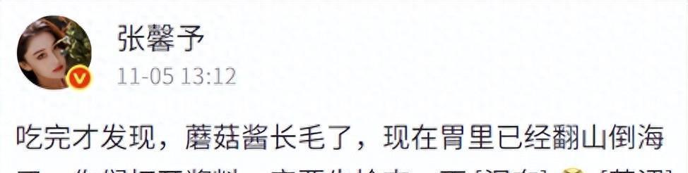 张馨予在微博里说,她一个人在广东的家里,吃了长了毛的蘑菇酱以后,胃里就开始翻江倒海了。其实她并不是特别节俭,只是吃东西之前没仔细看,直接就舀起来吃了。